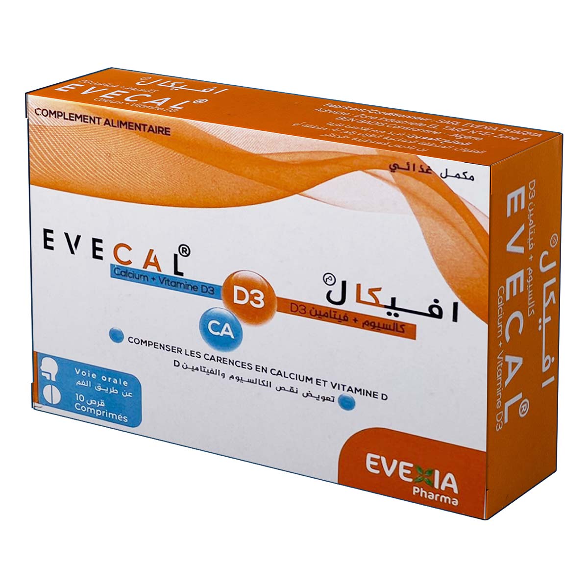 EVECAL® is a food supplement in tablet form designed to correct vitamin D and calcium deficiencies. It contains calcium carbonate and vitamin D3, which play an essential role in the growth and maintenance of bone density, as well as the preservation of bone health. Vitamin D3 facilitates intestinal absorption of calcium and its fixation on bones.