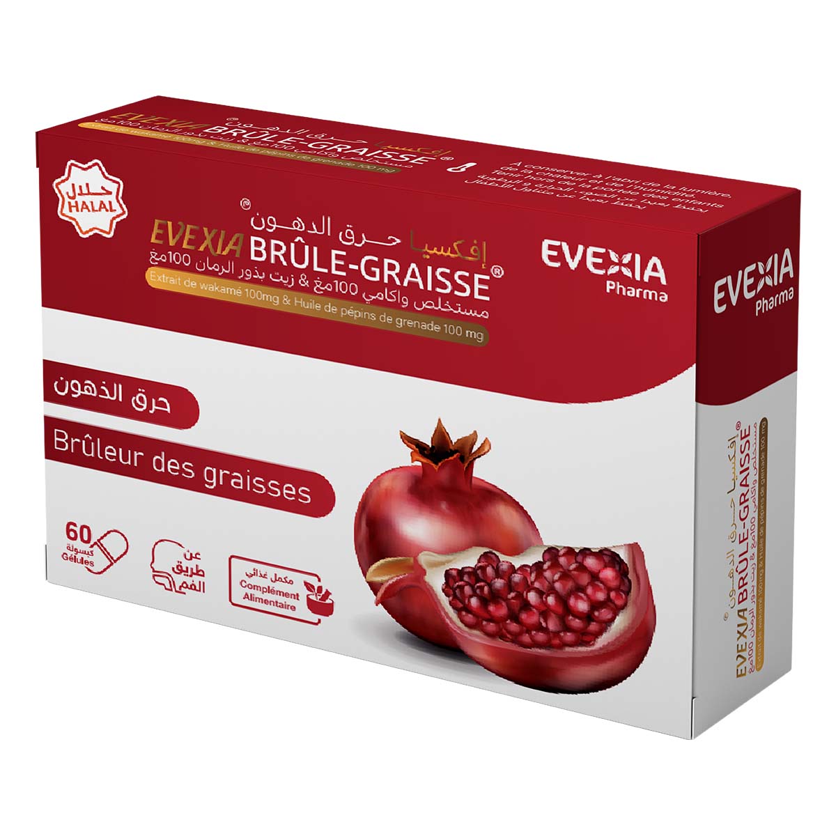EVEXIA BRÛLE-GRAISSE® est un complément alimentaire formulé à partir d’extraits de wakamé et d’huile de pépins de grenade. Le wakamé, une algue brune, est reconnu pour ses bienfaits divers pour la santé, notamment son effet brûle-graisse grâce à la Fucoxanthine. L’acide pucinique, extrait des pépins de grenade, joue un rôle majeur dans la réduction des graisses. La combinaison de la Fucoxanthine et de l’acide punicique augmente les dépenses énergétiques et favorise la décomposition des graisses. Ces composés agissent en synergie dans un seul produit, permettant de brûler jusqu'à 400 kcal par jour.